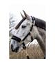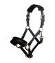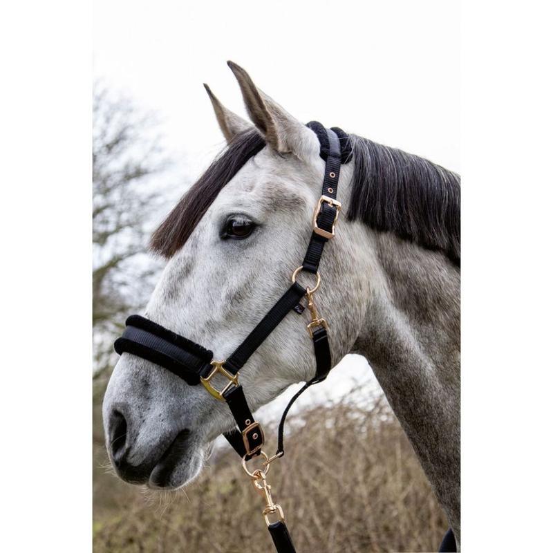 Kantar firmy HKM. Wykonany z mocnej taśmy nylonowej. Podszyty miękkim, syntetycznym futerkiem. Posiada możliwość regulacji w części potylicznej i nosowej. Pasek podgardla zapinany na karabińczyk. Okucia w kolorze rosegold.
