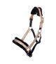 Kantar firmy HKM z kolekcji Rosegold Glitter. Część potyliczna i nachrapnik podszyty miękkim sztucznym futerkiem. Pasek potyliczny regulowany z obu stron oraz regulowany nachrapnik.