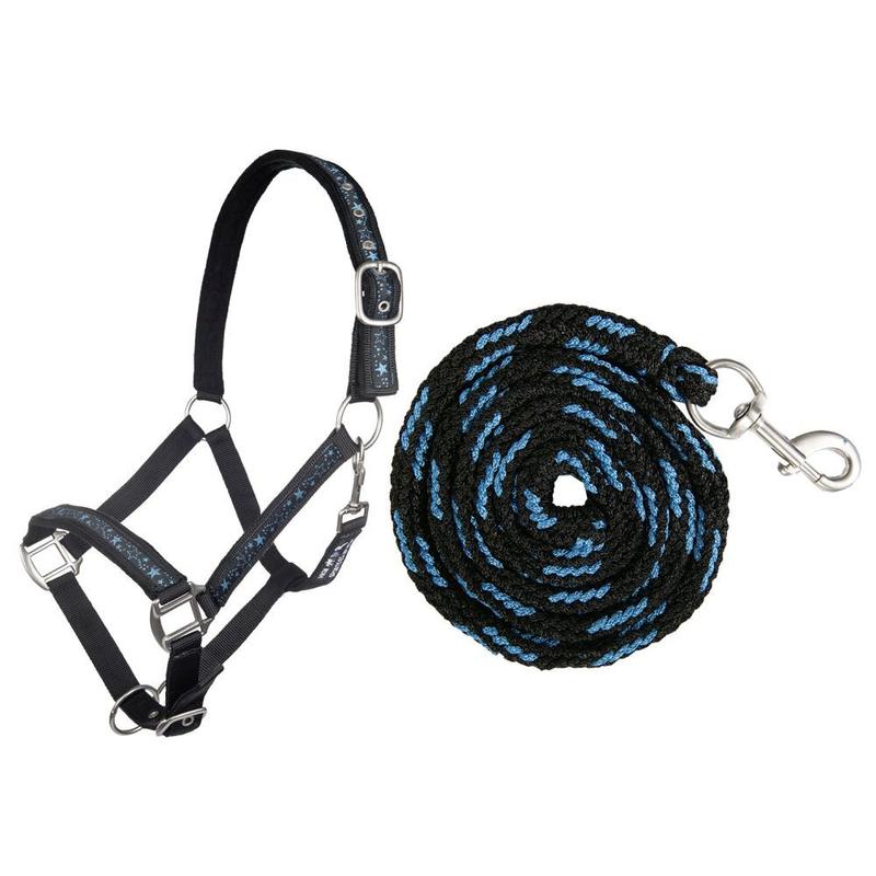 Kantar z uwiązem firmy HKM. Kantar wykonany z wytrzymałej taśmy nylonowej. Posiada 2-punktową regulację, która zapewnia idealne dopasowanie do głowy konia. Paski policzkowe, nachrapnik oraz naczółek ozdobiony taśmą z nadrukiem w gwiazdki. Komplet zawiera