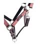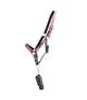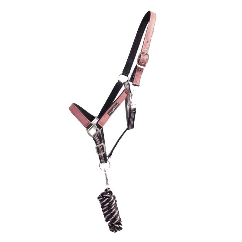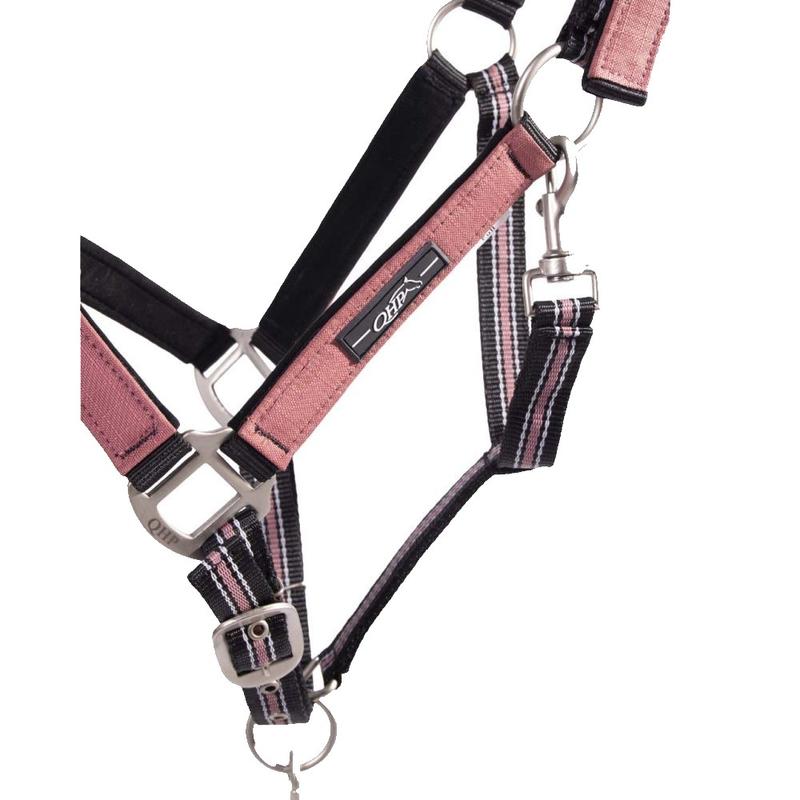Kantar z uwiązem QHP Primrose różowoszaryWyściełany miękkim podszyciem, ozdobiony efektownym wzorem. Wyposażony w luksusowe czarne metalowe elementy. W zestawie uwiąz w tym samym kolorze i torba wielokrotnego użytku na zamek błyskawiczny. Taśma materiałowa: poliester, polipropylen Lina materiałowa: poliester Luksusowy zestaw obroży na głowę z...