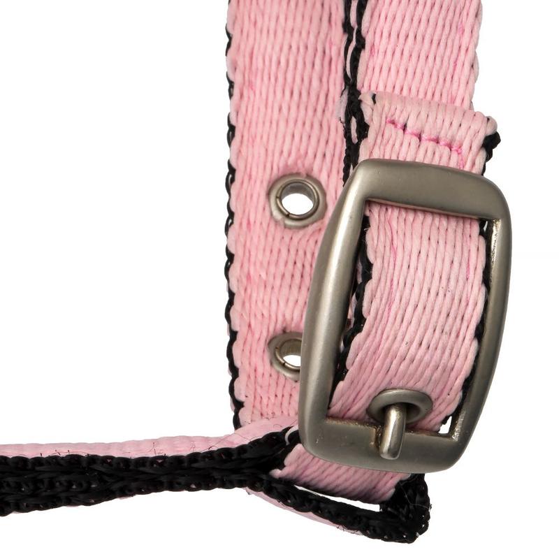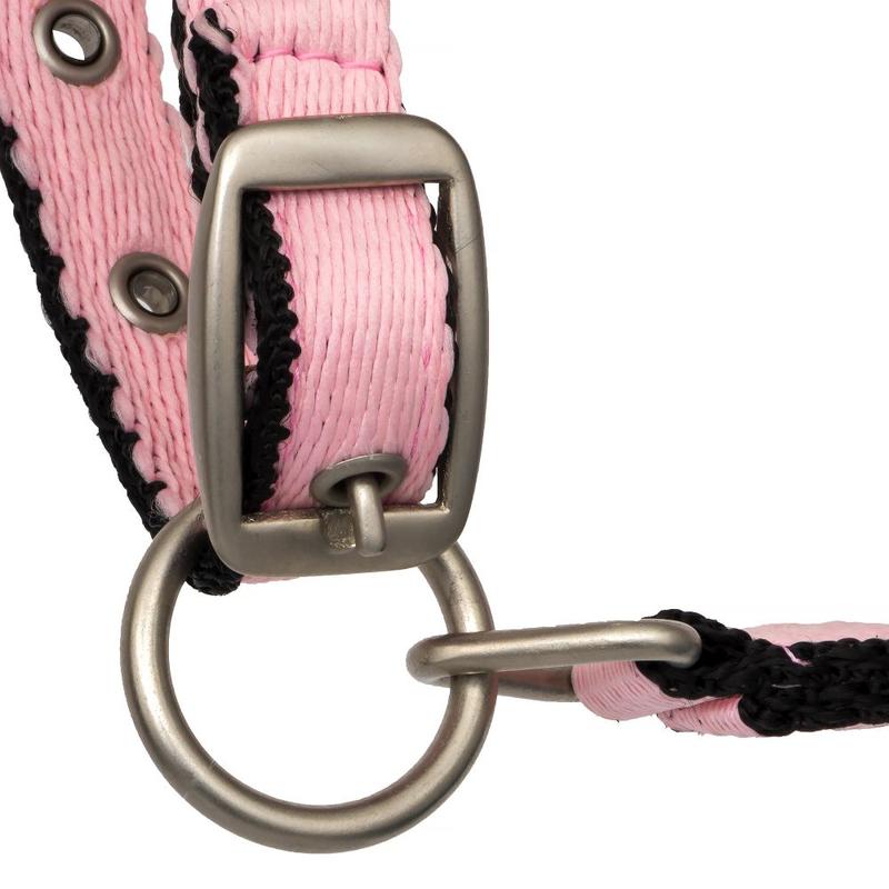 Obroża dla konia firmy Ekkia. Podwójnej grubości polipropylen ze skórzanymi szlufkami. Wyposażona w klamry mosiężne.