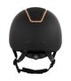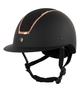 Kask charakeryzuje się dużym daszkiem oraz solidną konstrukcją z włókna węglowego. Lakka skorupa wykonana z mocnego materiału ABS. Góra pokryta brokatowym materiałem obramowanym lamówką w kolorze różowegozłota. Wyposażony w sześć otworów wentylacyjnych.