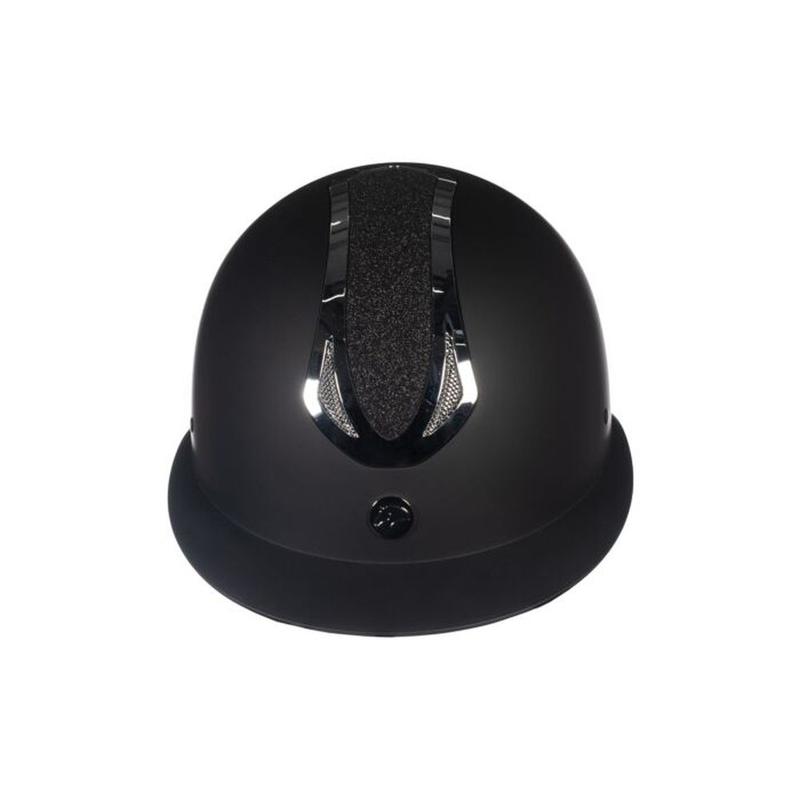 Kask firmy HKM. Wykonany z najwyższej jakości materiałów. Zewnętrzna skorupa wykonana z PCV doskonale chroni przed wstrząsami i uderzeniami, pochłaniając energię, która wytworza się w trakcie upadku. Panel środkowy, z błyszczącą ramką i brokatowym wypełnienim oraz szeroki daszek, nadaje eleganckiego wyglądu. Kask posiada otwory wentylacyjne i wymienne podszycie. Wyposażony w regulację za pomocą pokrętła z tyłu kasku.