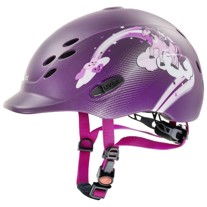 Kask jeździecki Onyxx Princess firmy Uvex. Dedykowany dla dzieci. Poprzez zastosowanie konstrukcji inmould, kask spełnia najwyższą ochronę, jest bardzo lekki, wygodny z bardzo dobrą wentylacją. Wnętrze kasku wyścielane jest oddychająca, wyciąganą wkładką, zapewniającą komfort użytkowania podczas intensywnych treningów. Posiada trzypunktową regulację, dzięki czemu kask idealnie dopasujemy do głowy. Łatwy w zapinaniu i rozpinaniu jedną ręką. Ozdobiony grafiką z małą księżniczką. Spełnia wszystkie zapisy obowiązującej normy VG1 01.040 2014-12.