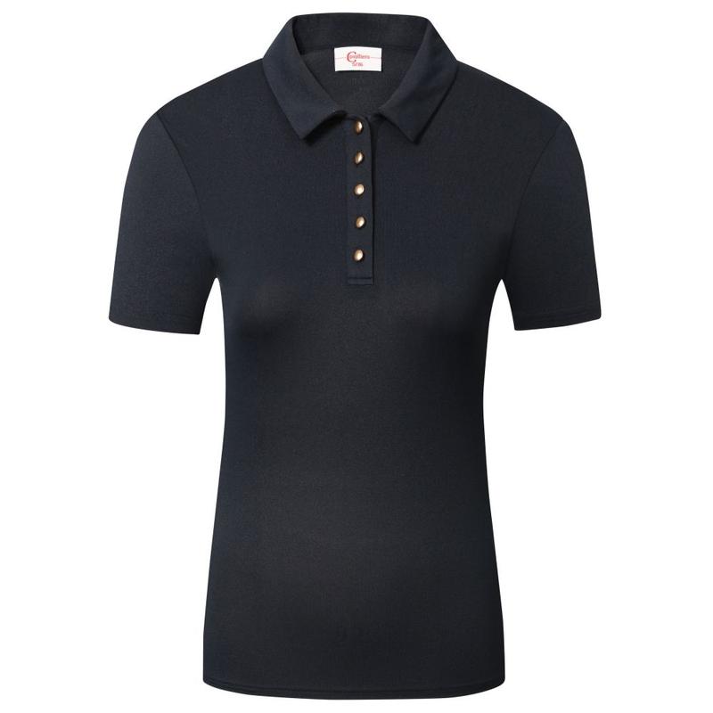 Koszulka damska Polo firmy Covalliero z kolecji wiosna-lato. Wykonana z elastycznej, funkcjonalnej tkaniny z wstawkami z siateczki dla lepszej oddychalności. Zapinana na złote ozdobne guziki. Ozobiona z tyłu logo producenta.