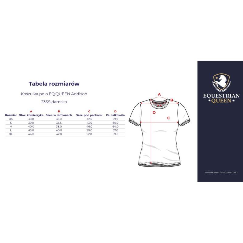 Klasyczna koszulka polo firmy Equestrian Queen. Wykonana z technicznego materiału, który jest lekki, elastyczny i oddychający. Wyposażona w zapinanie na napy. Ozdobiona kryształkami w kolorze różowego złota i nadrukami w pasującym odcieniu.