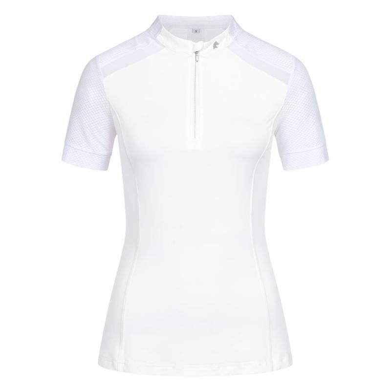 Koszulka damska polo firmy Pikeur z kolekcji wiosna-lato 2025.Wygodna, funkcjonalna tkanina. Dopasowany krój, dół koszulki lekko zaokrąglony, a dekold okrągly. Tkanina perforowana pod pachami oraz z tyłu, dzięki czemu zapewnia lepszą cyrkulację powietrza. Materiał: 70% poliester, 30% elastan.