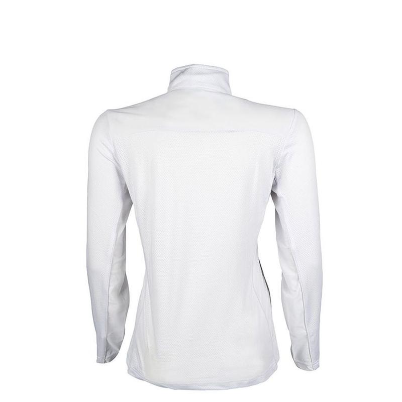 Bluzka konkursowa LG Basic Mesh firmy HKM z długim rękawem i o sportowy kroju. Wykonana z oddychającego, odpornego na zabrudzenia materiału łączącego poliester i elastan. Charakteryzuje się wcięciem w tali oraz dużą elastycznością. Znakomicie uzupełnia