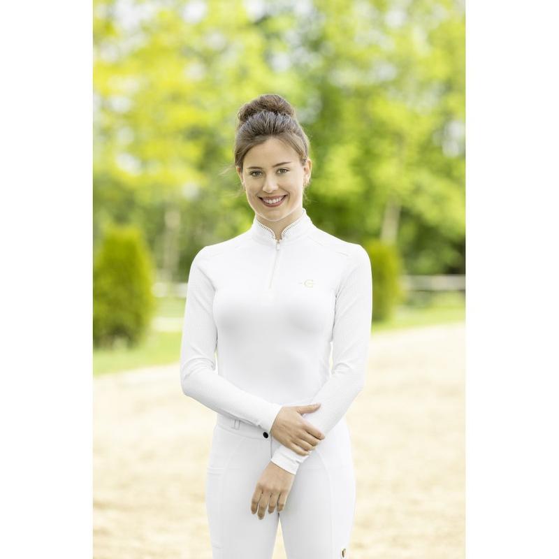 Nasza koszulka konkursowa łączy w sobie sportowe osiągi ze stylowym wzornictwem. Oddychający, elastyczny materiał zapewnia optymalny komfort noszenia i maksymalną swobodę ruchów w siodle. Dopasowany krój podkreśla sylwetkę, a elegancka stójka z dyskretnymi brokatowymi aplikacjami dodaje jej uroku. Stójka z zamkiem błyskawicznym