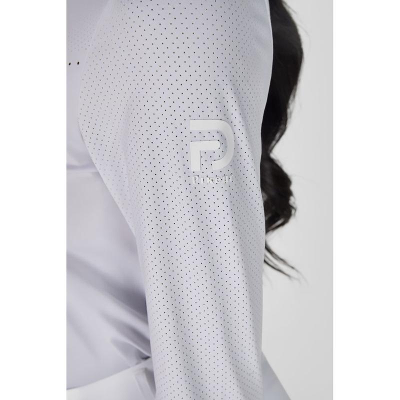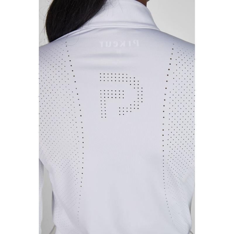 Koszulka konkursowa firmy Pikeur z kolekcji wiosna-lato 2026. Funkcjonalna koszula konkursowa wykonana z gładkiego, elastycznego materiału. Ukryty zamek błyskawiczny obok wstawki ze szklanych koralików . Laserowe cięcia na przednim szwie bocznym i tylnym panelu.Materiał: 78% poliamid, 22% elastan.