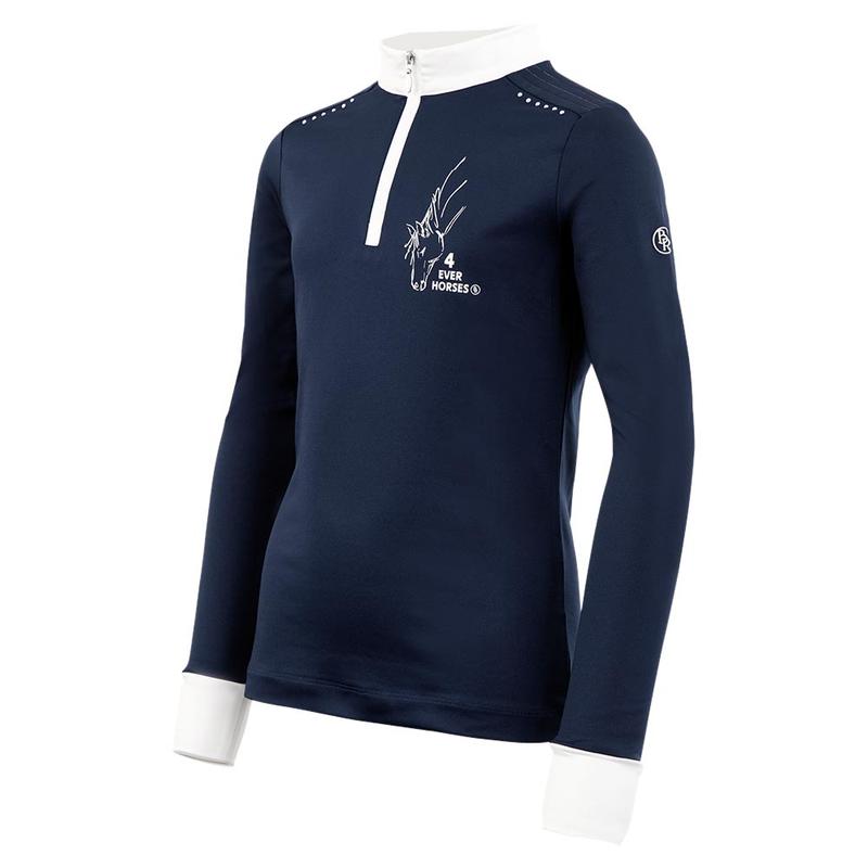 Koszulka konkursowa młodzieżowa firmy Pikeur z kolekcji wiosna-lato 2024. Z elegancką stójką, delikatnie ozdobioną rzędem cyrkonii. Zapinana z przodu na zamek błyskwiczny. Wykonana z lekkiego, przewiewnego materiału. Materiał: 55% bawełna, 45% poliester.