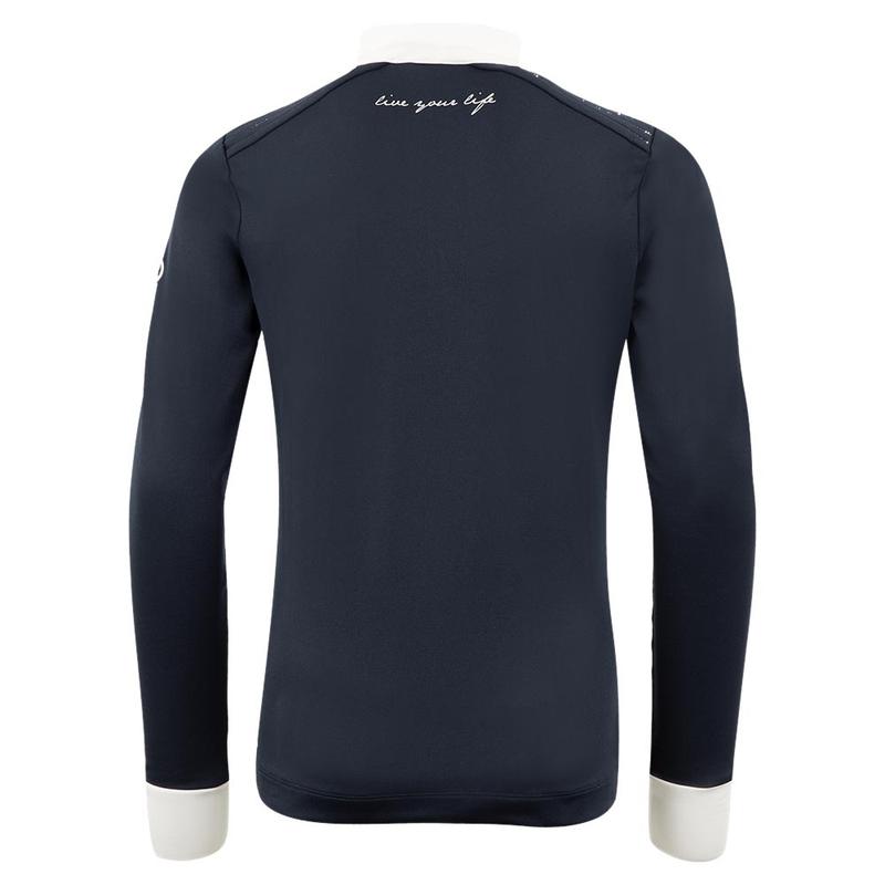 Koszulka konkursowa z długim rękawem firmy Pikeur z kolekcji wiosna-lato 2025. Wykonana z lekkiej przewiewnej tkaniny ze wstawkami z siateczki z przodu, tyłu oraz pod pachami. Kołnierzyk zapinany na suwak. Materiał: 82% poliester, 18% elastan.