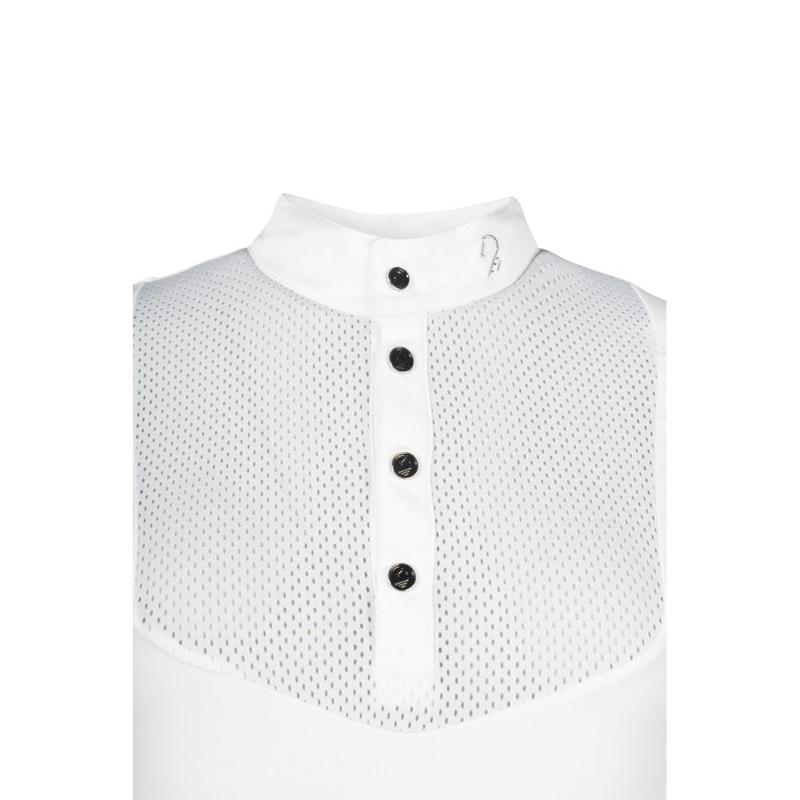 Koszulka konkursowa Amalfi marki Lauria Garrelli to ekskluzywna jakość i elegancki design. Wykonana z oddychającego, elastycznego materiału zapewniającego maksymalny komfort i optymalną swobodę ruchów - idealny na wymagające dni pokazowe. Eleganckie detale na kołnierzyku i wysokiej jakości zapięcie na guziki nadają koszuli stylowy wygląd. Strategicznie rozmieszczone wstawki z siateczki gwarantują doskonałą cyrkulację powietrza, dzięki czemu możesz utrzymać przyjemną temperaturę ciała nawet w ciepłe dni. Całość dopełnia klasyczna stójka, która tworzy elegancką sylwetkę.