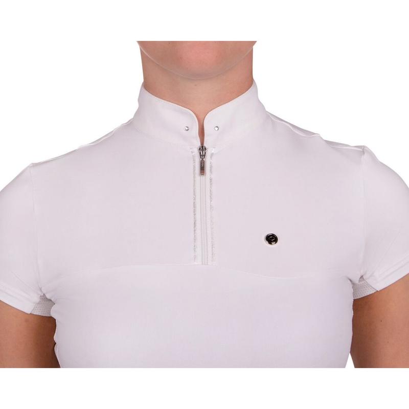 Odporna na promieniowanie UV koszulka konkursowa Z zamkiem błyskawicznym i błyszczącą obwódką po obu stronach Ze stójką z dwoma diamentami Koszulka wykonana jest z szybkoschnącego i odprowadzającego wilgoć materiału.
