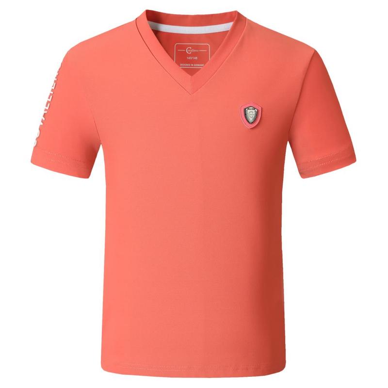 Koszulka młodzieżowa firmy Covalliero. Elegancka koszulka z wycięciem w kształcie litery V. Wykonana ze sportowego i oddychającego materiału. Można prać w pralce w temperaturze 30°C.