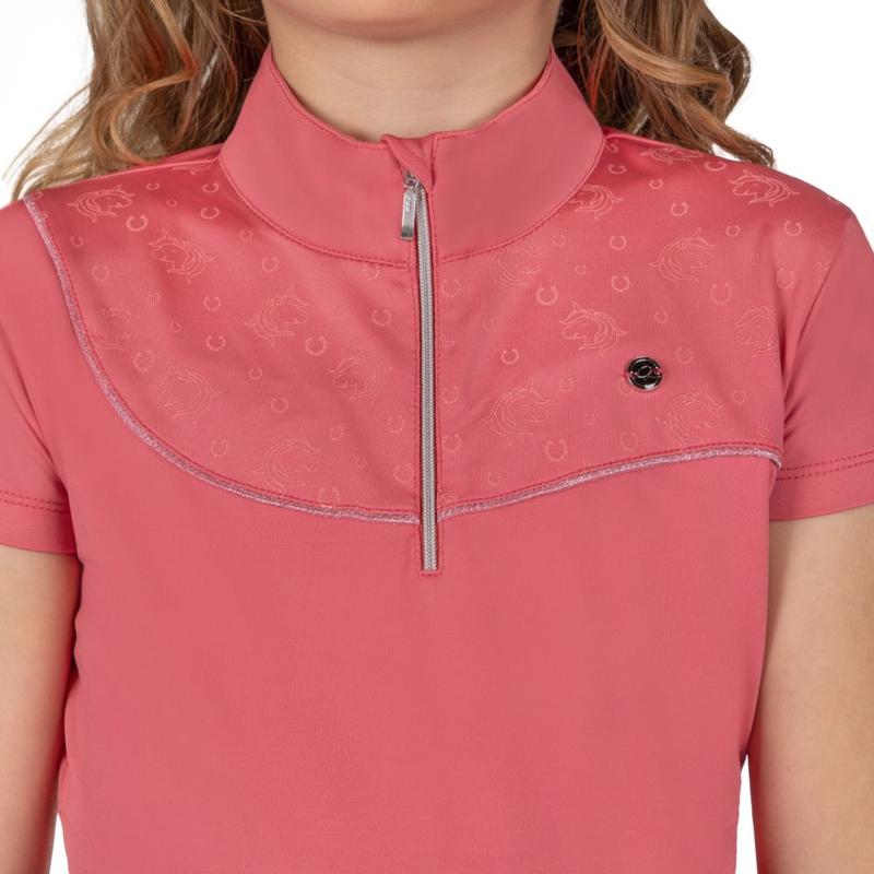 Koszulka firmy QHP. Koszulka sportowa z nadrukiem jednorożca i podkowy. Koszulka wykonana z elastycznego materiału. Ozdobiona po lewej stronie szpilką Q-pin. Wyposażona w błyszczącą lamówkę z przodu i zamek błyskawiczny 1/4 z przodu.