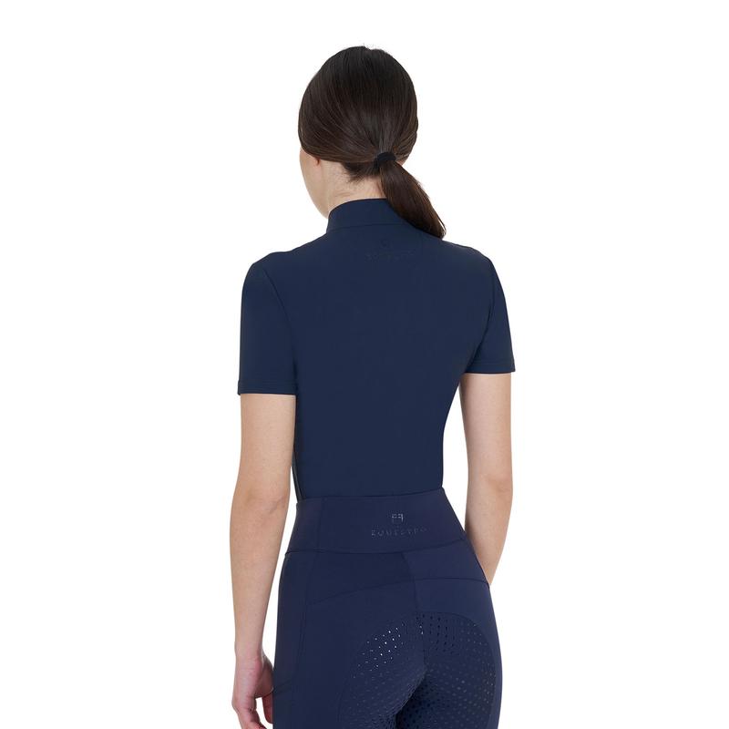 Koszulka konkursowa z półrękawem i zamkiem z przodu firmy Boos Equestrian. Zamek błyskawiczny ma nadrukowane subtelne, tonalne logo BOSS Equestrian. Na piersi znajduje się naszywka ze sztucznej skóry z logo BOSS. Materiał:78% POLIAMID / 22% ELASTAN.