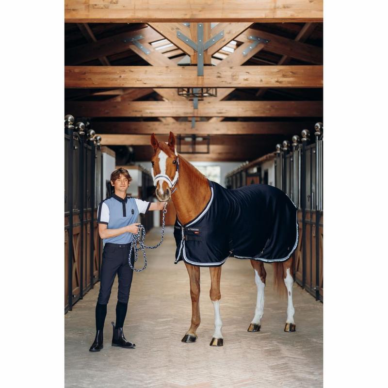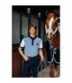 Koszulka konkursowa męska z krótkim rękawkiem z firmy Boss Equestrian. Zapinana na guziki z przodu oraz lamówką w charakterystyczny pasek. Na piersi znajduje się logo BOSS w postaci naszywki z imitacji skóry. Materiał: 75% poliamid, 25% elastan.