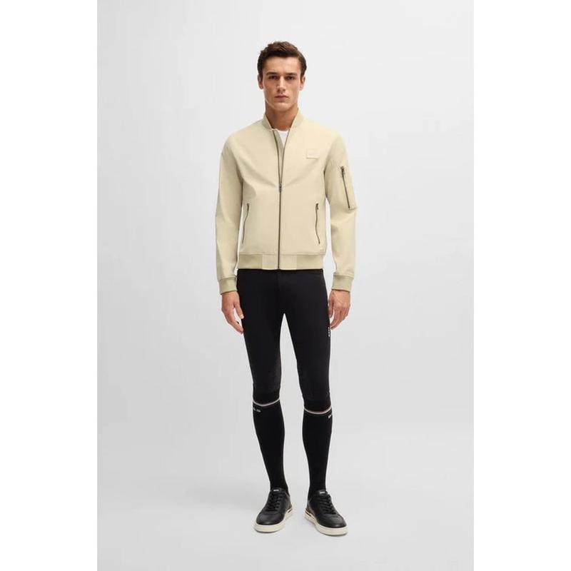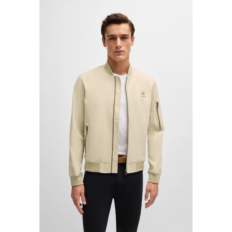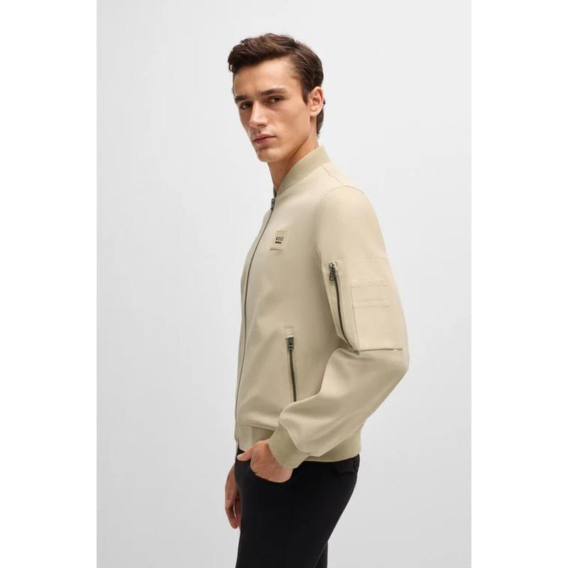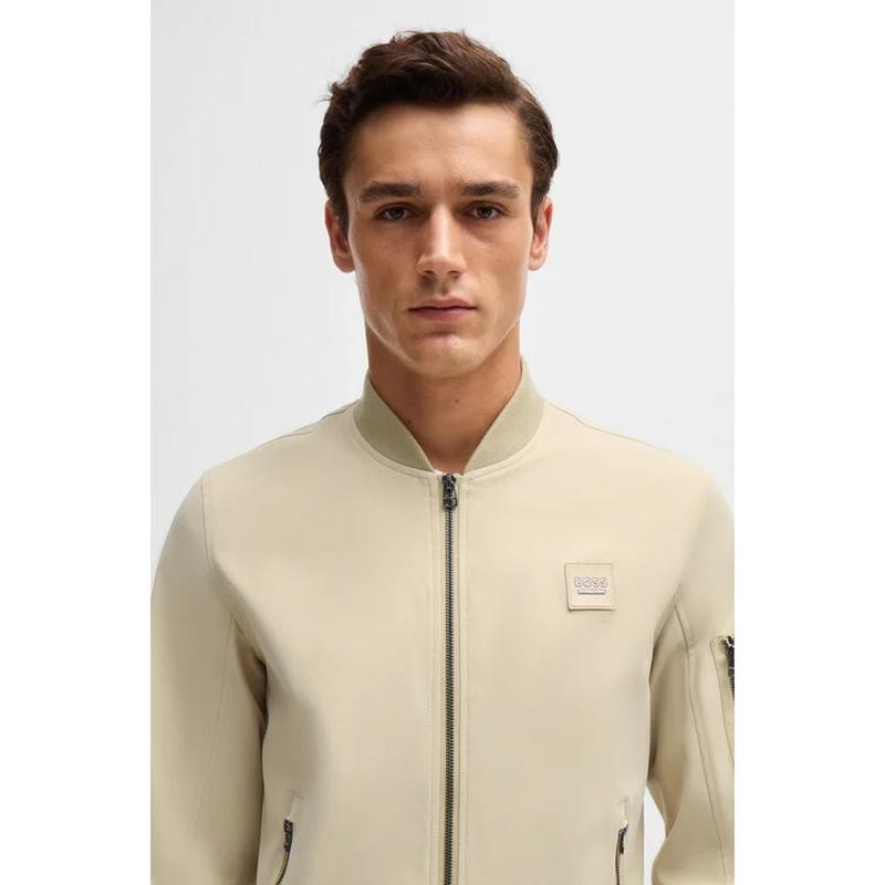 Kurtka wykonana z zaawansowanego technologicznie materiału, wodoodpornego i wyglądającego jak bawełna. Na lewym ramieniu naszyta kieszeń zapinana na zamek, naszywka z logo BOSS wykonana z imitacji skóry oraz dwie przednie kieszenie zapinane na zamki i mankiety wykończone ściągaczem.