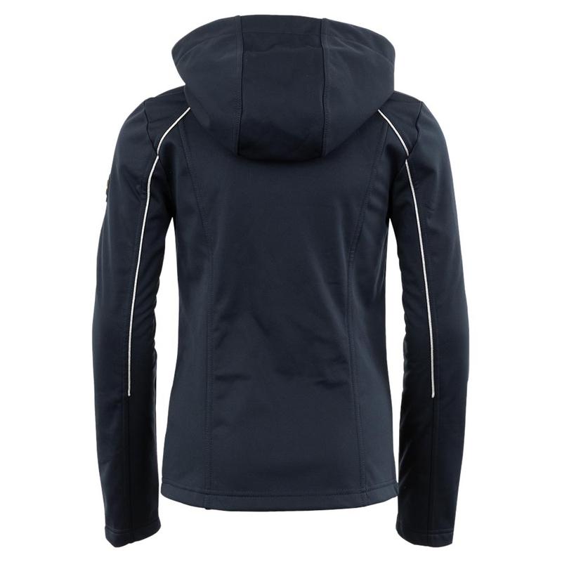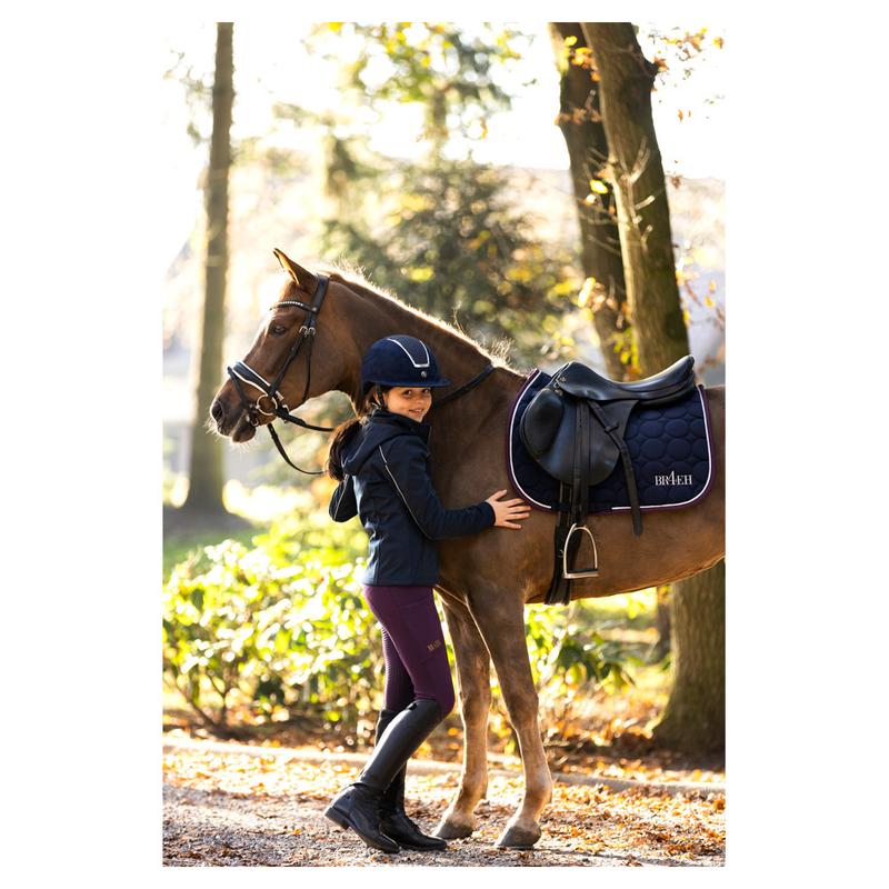 Młodzieżowa kurtka zimowa firmy Horze. Wyposażona w dwukierunkowy zamek błyskawiczny, odblaskowe paski na rękawach i karczku oraz odbijające swiatło brokatowe kropki na tkaninie w kolorze fioletowym. Dodatkowo posiada odpinany kaptur i regulowaną talię z tyłu.