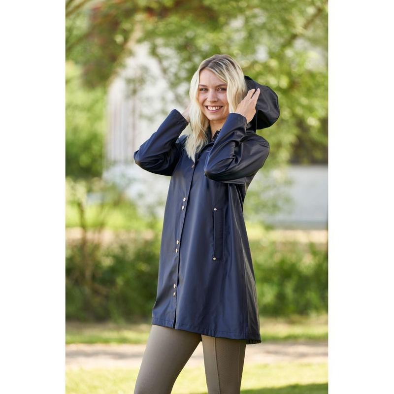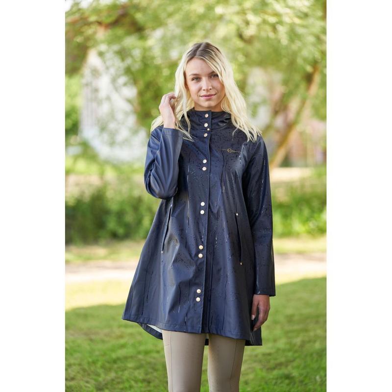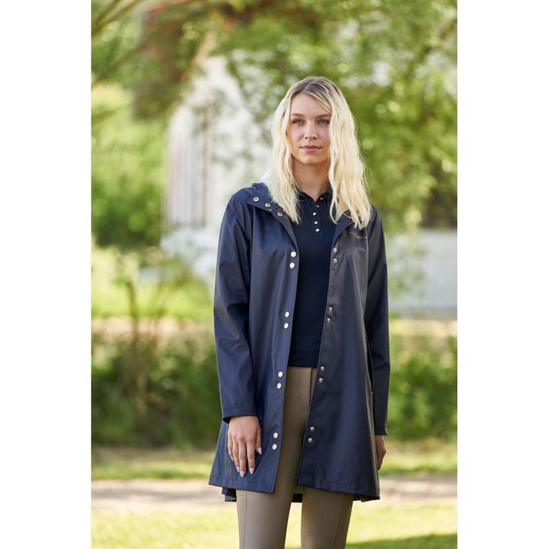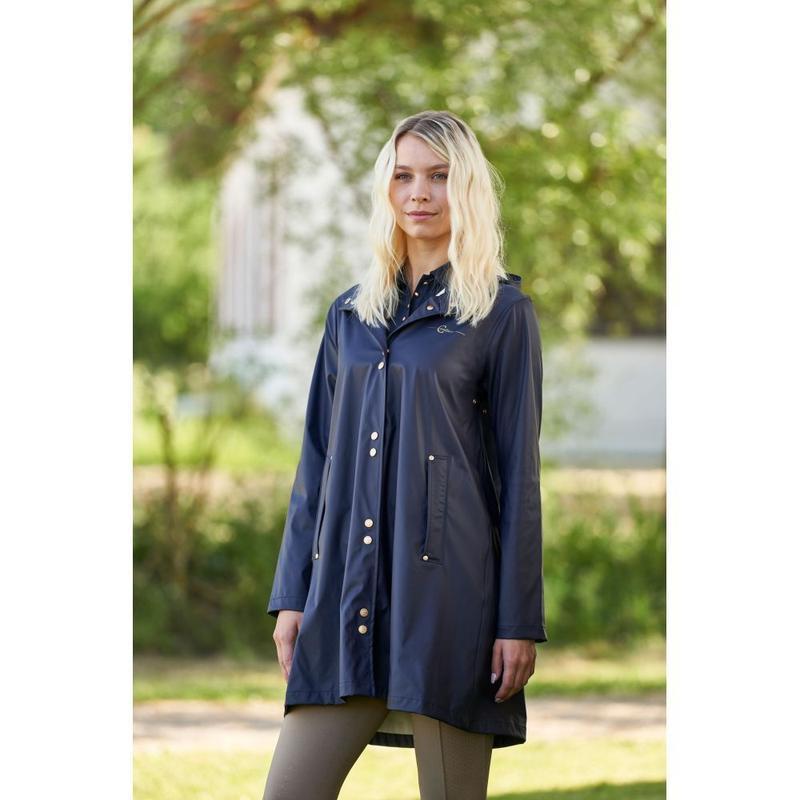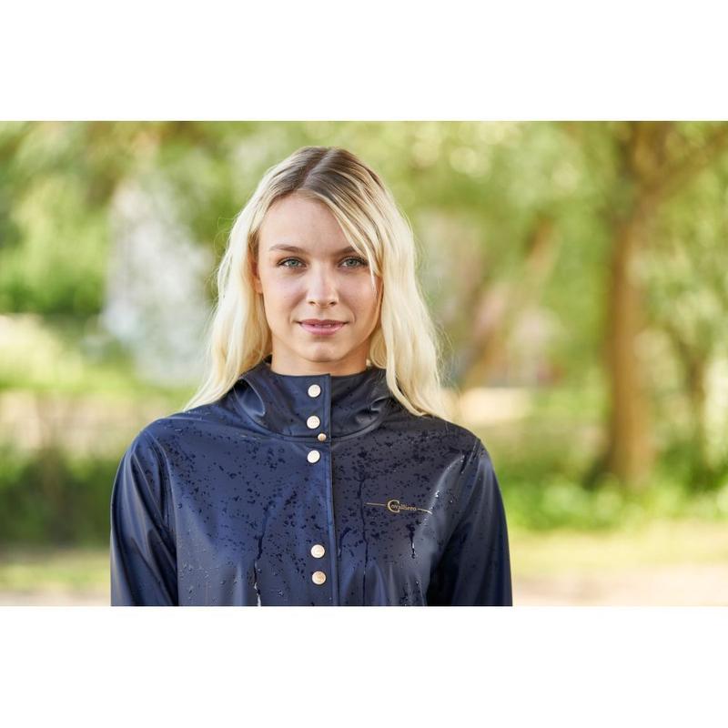 Kurtka przeciwdewszczowa przedłużana firmy Cavalliero z kolekcji wiosna-lato. Wykonana z przyjemnego, rozciągliwego materiału. Zapinana na ozdobne, złote napy. Wyposazona w kaptur i dwie kieszenie. Ozdobiona złotym logo producenta.