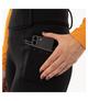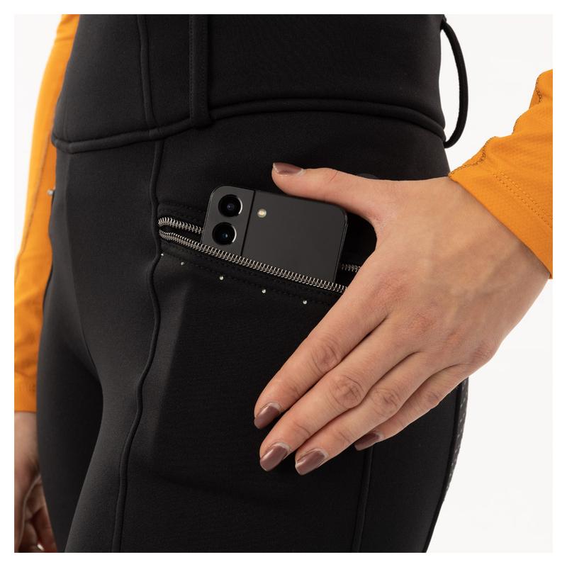 Legginsy damskie FIRMY Anky. Wykonane z elastycznego, grubego, szczotkowanego materiału o właściwościach oddychających i odprowadzających wilgoć. Zapewniają ciepło. Spodnie posiadają wysoki, wygodny pas z małą elastyczną taśmą wewnątrz oraz szlufkami. Pełen lej silikonowy zapewnia dodatkowy odpowiednie dopasowanie w siodle. Wyposażone zostały w kieszenie na telefon komórkowy po obu stronach z kryształkami w kolorze brązu i nylonowym zamkiem błyskawicznym. Ozodbione również przezroczystym nadrukiem z logo producenta na prawej nogawce.