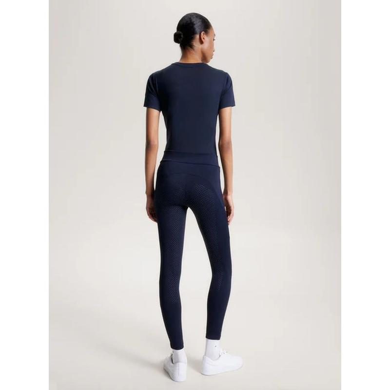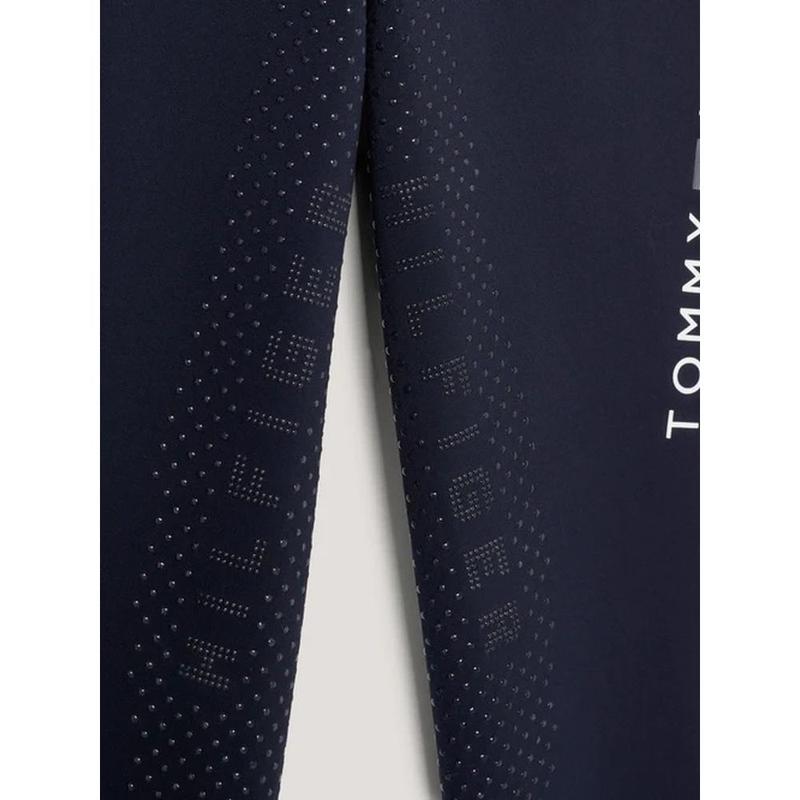 Techniczne legginsy jeździeckie Elmira. Legginsy te mają klasyczne, charakterystyczne udo z logo Tommy Hilfiger i są wyposażone w silikonowy uchwyt oraz poręczną kieszeń na telefon komórkowy na lewym udzie. Logo Tommy Hilfiger wewnątrz paska i na dole z t