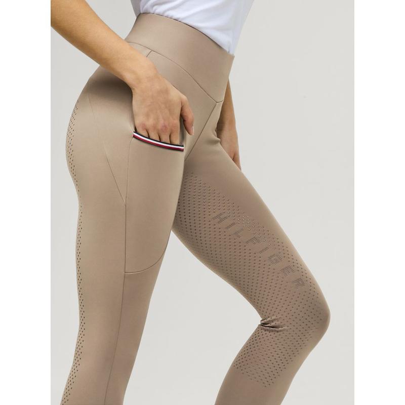 Techniczne legginsy jeździeckie Elmira. Legginsy te mają klasyczne, charakterystyczne udo z logo Tommy Hilfiger i są wyposażone w silikonowy uchwyt oraz poręczną kieszeń na telefon komórkowy na lewym udzie. Logo Tommy Hilfiger wewnątrz paska i na dole.