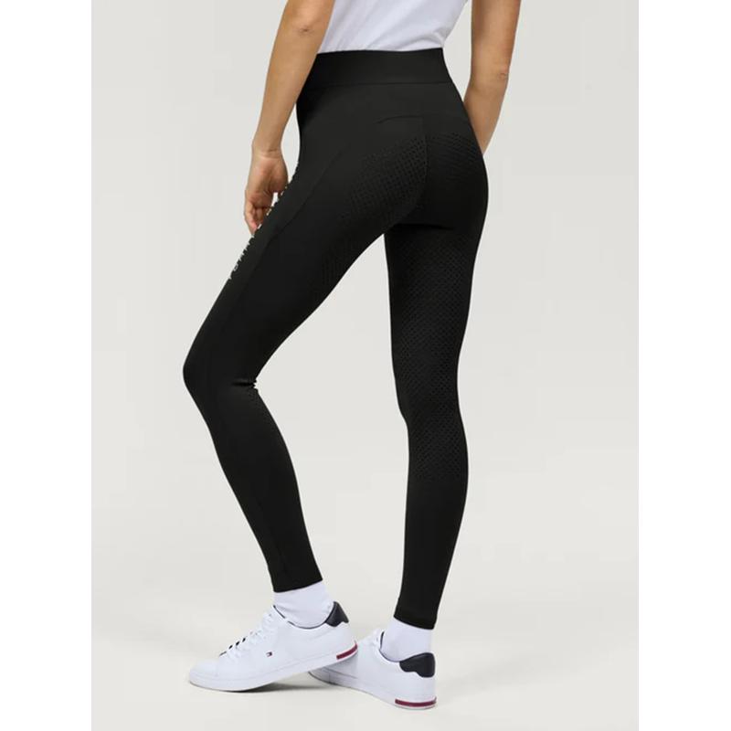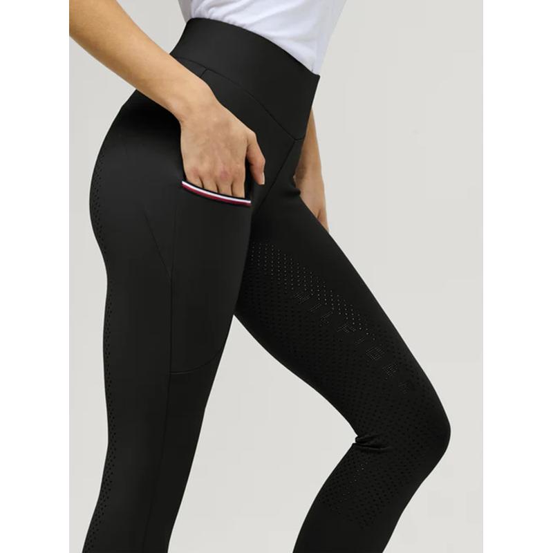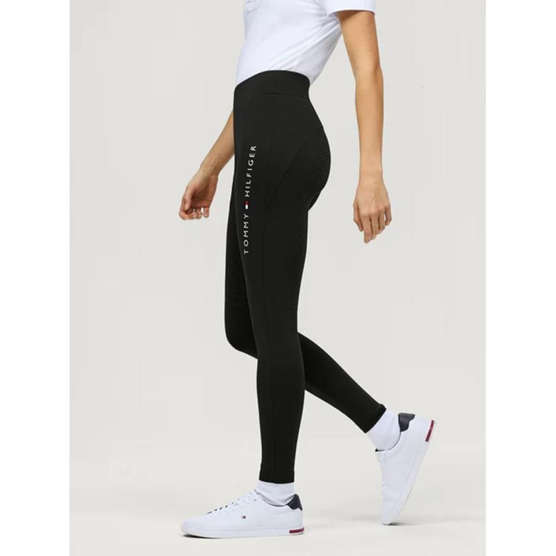 Techniczne legginsy jeździeckie Elmira. Legginsy te mają klasyczne, charakterystyczne udo z logo Tommy Hilfiger i są wyposażone w silikonowy uchwyt oraz poręczną kieszeń na telefon komórkowy na lewym udzie. Logo Tommy Hilfiger wewnątrz paska i na dole.