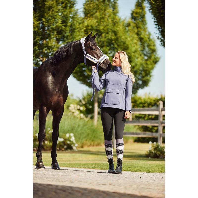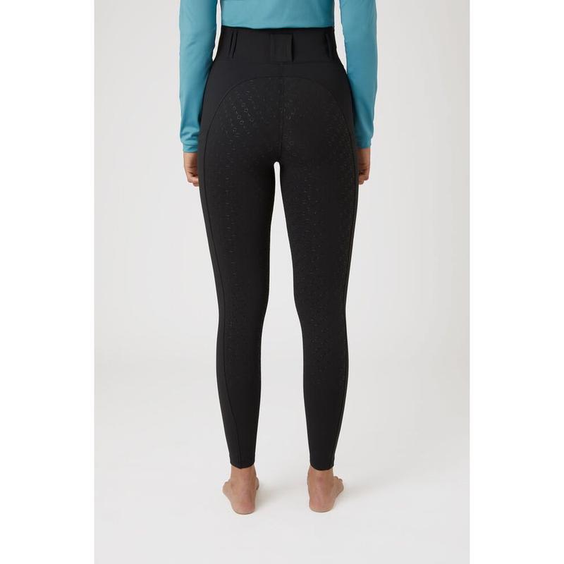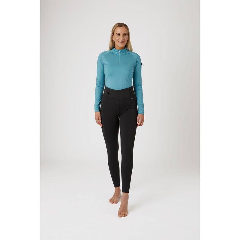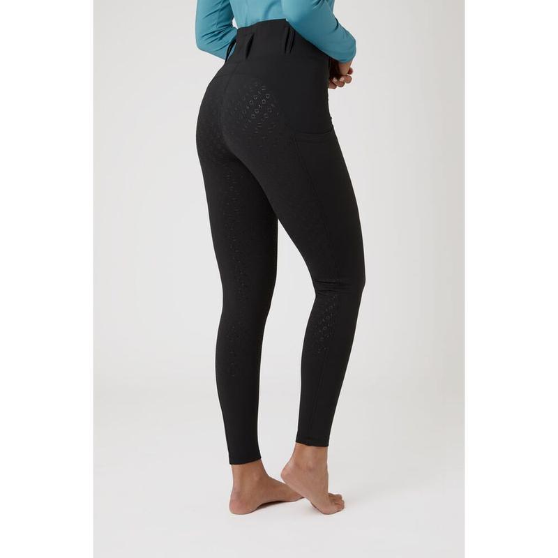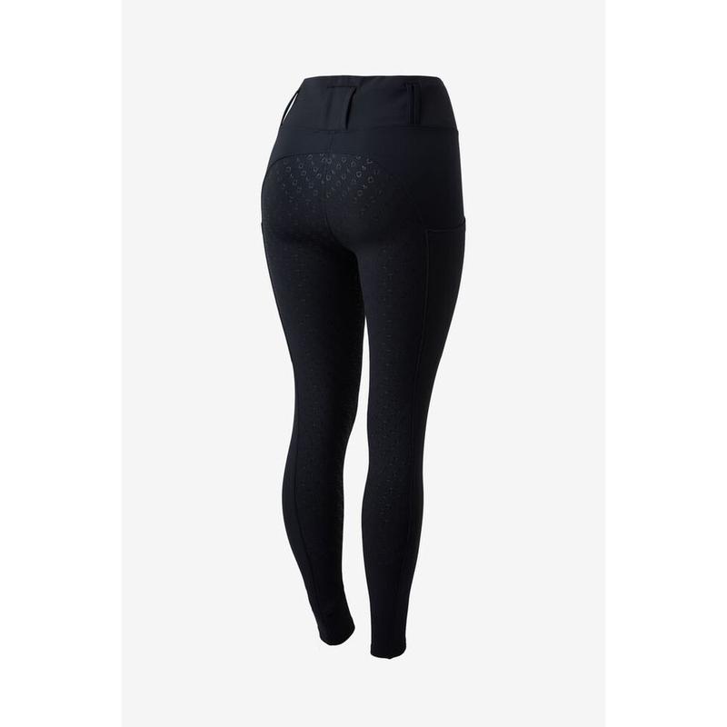 Legginsy damskie z wysokim stanem i pełnym lejem firmy Horze. Uszyte z miękkiego, rozciągliwego materiału. Zachowują kształt materiału, rozciągliwe w 4 kierunkach. Posiadają dwie kieszenie na nogawkach i małe metalowe logo producenta na biodrze.