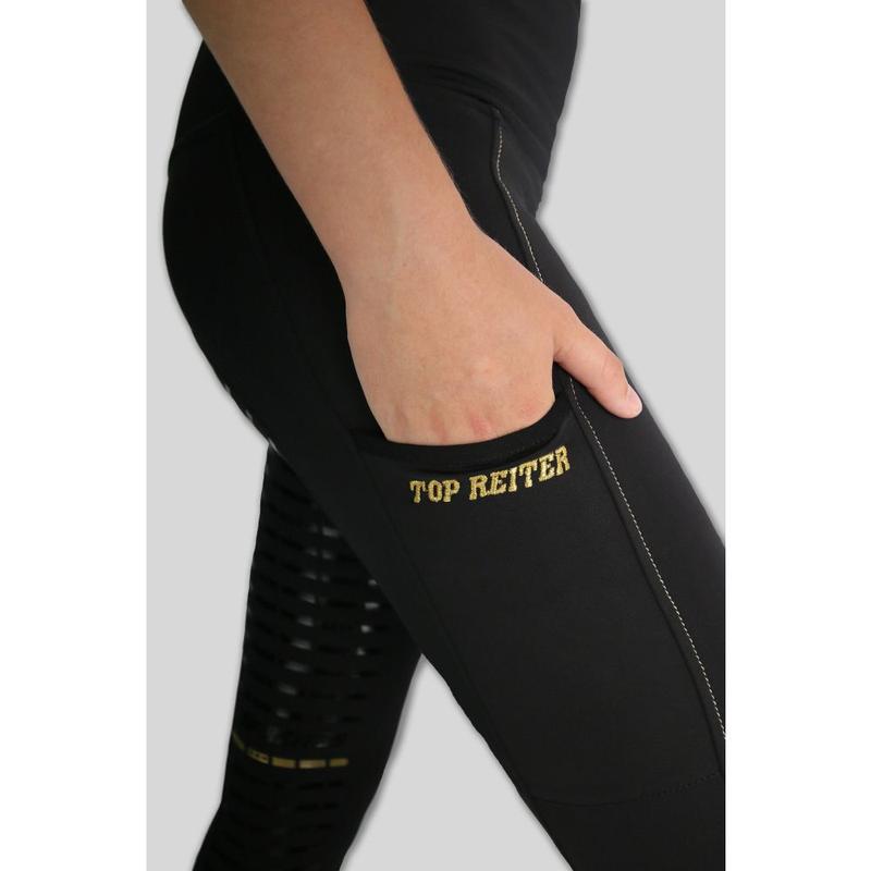 Wysokiej jakości legginsy firmy Top Reiter o świetnym kształcie i komforcie do jazdy i wypoczynku. Leginsy posiadają wysoki stan co zapewnia wysoki komfort noszenia. Posiadają również dwie boczne kieszenie. Doskolane sprawdzają się podczas wszelkich zajęć rekreacyjnych takich jak treningi, jazda konna czy zawody. Lekki, super wygodny materiał zapewnia również fantastyczny, bliski kontakt z koniem. Posiadają poziomą kieszeń tylną zapinaną na zamek YKK, pełny lej silikonowy, oraz logo TOP REITER z tyłu i z przodu nogawki. Materiał: rozciągliwy w czterech kierunkach, oddychający, odprowadzający wilgoć, szybkoschnący, doskonale zachowujący kształt. 72% poliester, 28% spandex. Prać w 30 stopniach, nie suszyć w suszarce.
