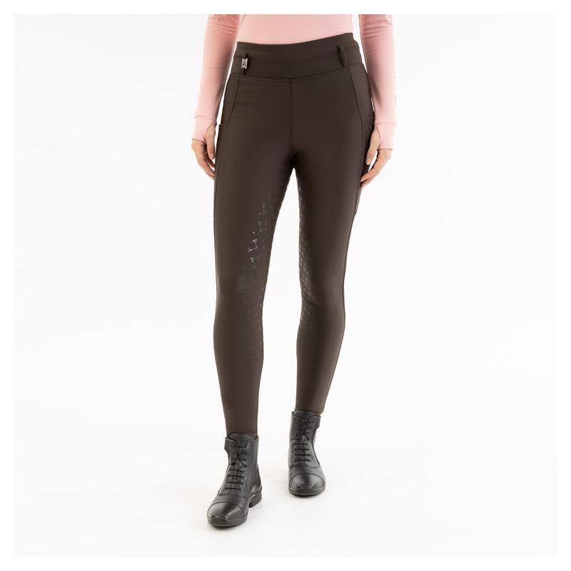 Elastyczna, gruba, szczotkowana tkanina z właściwościami oddychającymi i odprowadzającymi wilgoć, która zapewnia ciepło. Wyposażone w pełen lej silikonowy. Wysoka, elastyczna talia ze szlufkami na pasek i metalową lamówką z logo marki. Kieszeń na telefon komórkowy po obu stronach ozdobiona logo marki w kolorze metalu.