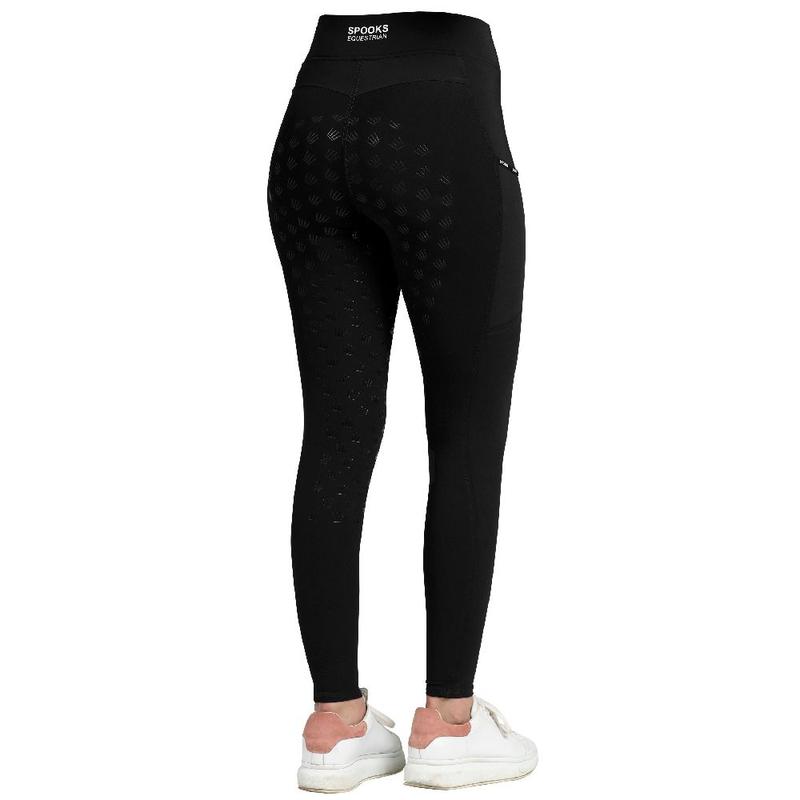 Legginsy zimowe damskie firmy Spooks. Wygodne legginsy wykonane z elastycznego materiału, z pełnym silikonowym lejem. Idealnie dopasowują się do ciała i zapewniają optymalną swobodę ruchów. Szeroki pas zapewnia wygodne dopasowanie na biodrach. Posiadają dwie elastyczne kieszenie po bokach nogawki. Wysokiej jakości wykończenie chwytu bryczesów zapewnia pewne dopasowanie w siodle. Ozdobione efektownym napisem SPOOKS na lewej nogawce, logo na pasku i lamówka SPOOKS na kieszeniach.