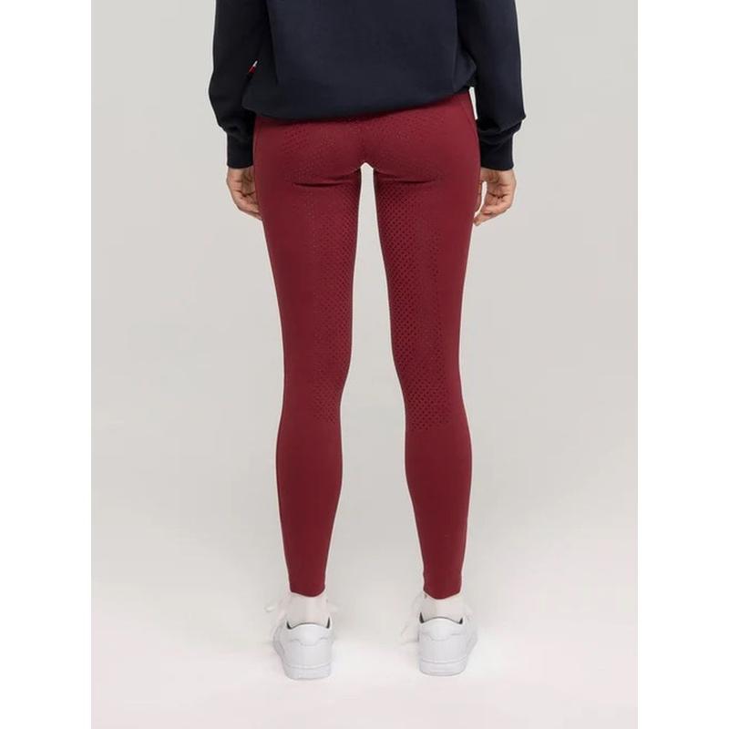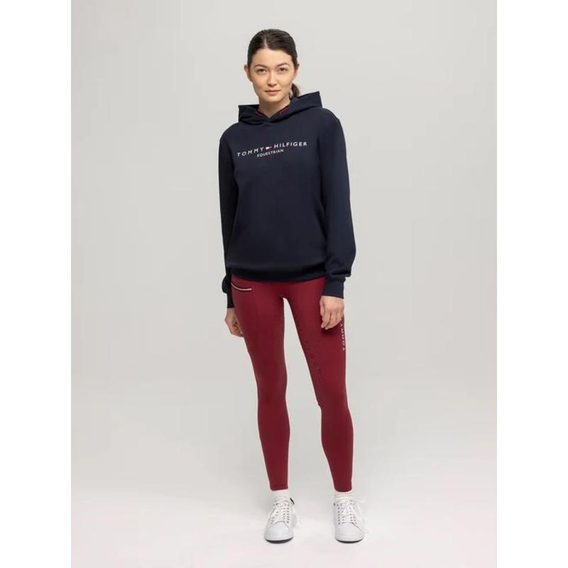 Techniczne legginsy jeździeckie Elmira. Legginsy te mają klasyczne, charakterystyczne udo z logo Tommy Hilfiger i są wyposażone w silikonowy uchwyt oraz poręczną kieszeń na telefon komórkowy na lewym udzie. Logo Tommy Hilfiger wewnątrz paska i na dole z t