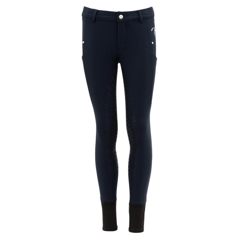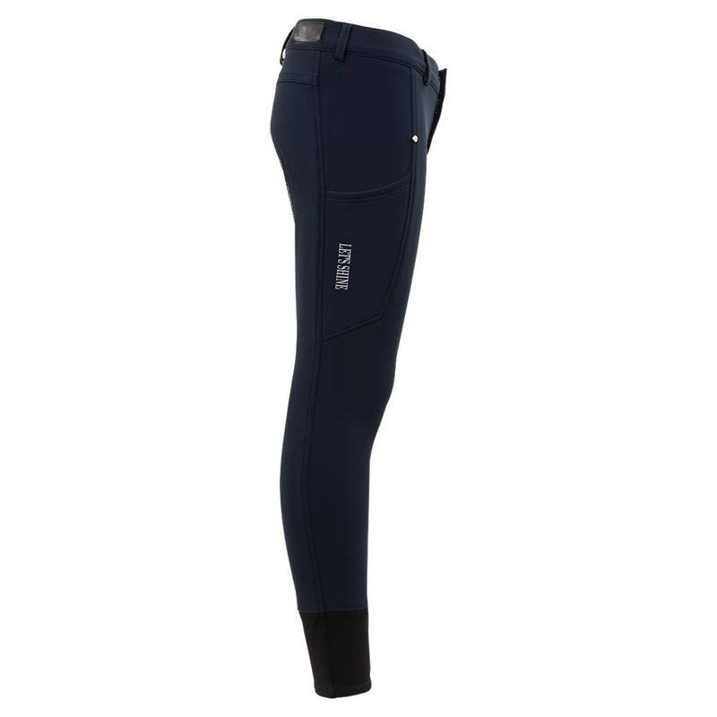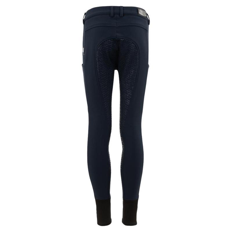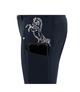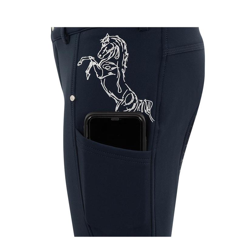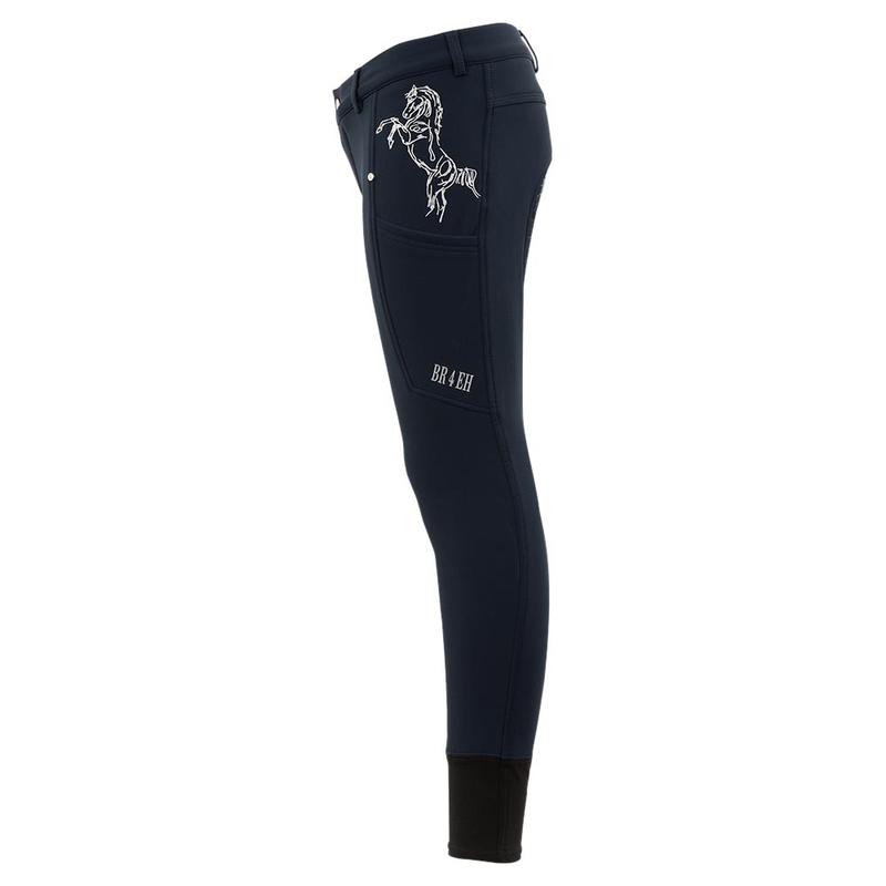 Bryczesy jeździeckiel firmy BR. Zapewniają ciepło w zimowe dni. Wykonane z wodoodpornego i oddychającego materiału Soft Shell, przyjemnego dla skóry. Posiadają głęboką boczną kieszeń na telefon komórkowy, kontrastowe szwy oraz regulowany pas z szlufkami. Ozdobione srebrnym nadrukiem konia nad lewą kieszenią i nadrukiem tekstu pod lewą i prawą kieszenią.