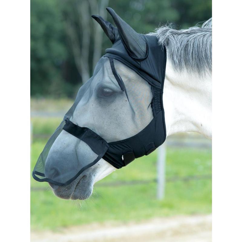 Maska siatkowa przeciw owadom firmy Horze. Stanowi znakomitą ochronę oczu oraz uszu konia. Właśnie w tych miejscach posiada siateczkę z delikatnej i miękkiej lycry co zapewnia wygodę i komfort. Idealnie dopasowuje się do głowy konia.