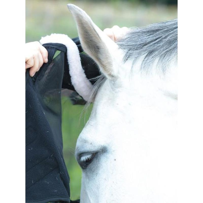 Maska siatkowa firmy Kerbl. Znakomicie chroni końskie oczy i uszy przed owadami. Dodatkowo materiał chroni także przed promieniowaniem UV. Materiał chroniący uszy wykonany z delikatniej, miękkiej i oddychającej tkaniny. Całość podszyta polarem, zapobiega to obtarciom oraz chroni delikatne miejsca. Maska zapinana na rzep.