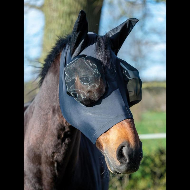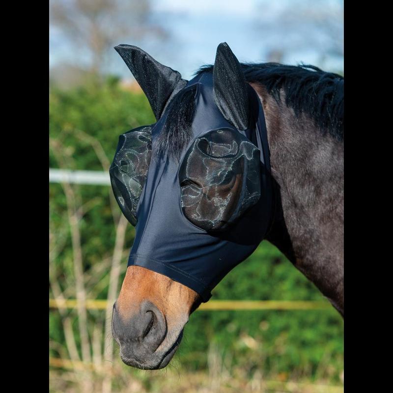 Maska siatkowa przeciw owadom firmy Horze. Stanowi znakomitą ochronę oczu oraz uszu konia. Właśnie w tych miejscach posiada siateczkę z delikatnej i miękkiej lycry co zapewnia wygodę i komfort. Idealnie dopasowuje się do głowy konia.
