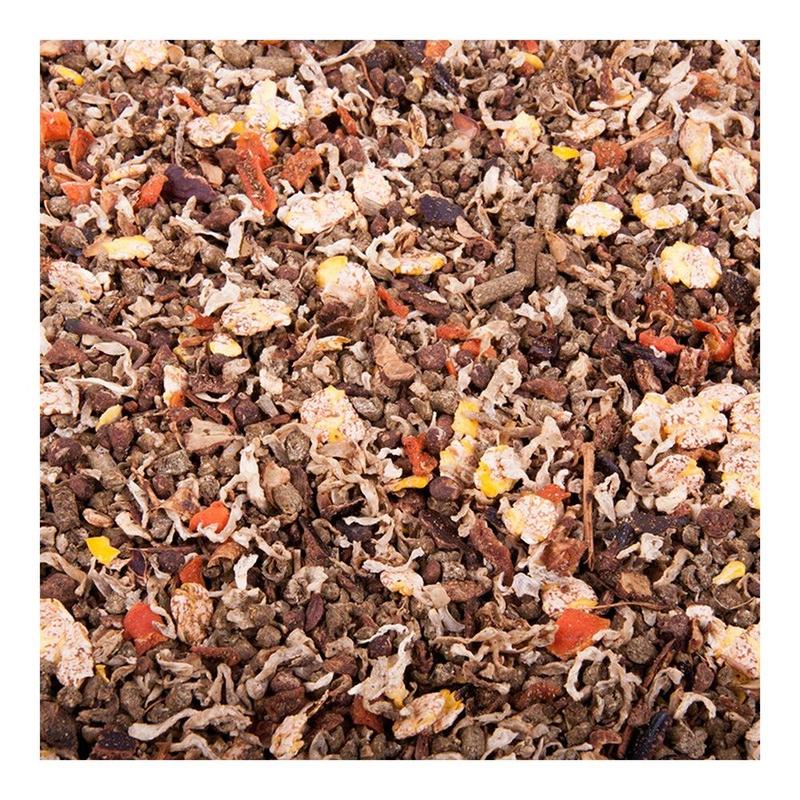 Wytłoki jabłkowe, łuska z nasion słonecznika, łuska z nasion lnu, pulpa z cykorii, płatki łubinu słodkiego, chleb świętojański, lucerna, sok jabłkowy, poekstrakcyjna śruta słonecznikowa, płatki marchwi, gliceryna, olej słonecznikowy