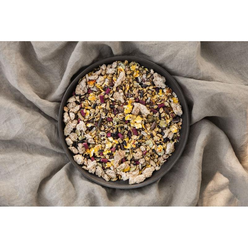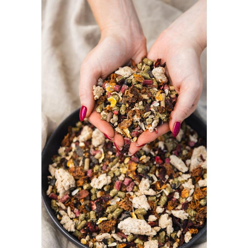 Jęczmień mikronizowany, granulat Grassland Everyday Care, kukurydza mikronizowana, otręby ryżowe, słód jęczmienny, granulowany susz z lucerny, wytłoki z aronii, makuch lniany, wytłoki z porzeczki, groch płatki, łuska słonecznika, pszenica ekstrudowana, olej lniany, liść melisy suszony, liść mięty pieprzowej suszony, chlorek sodu.