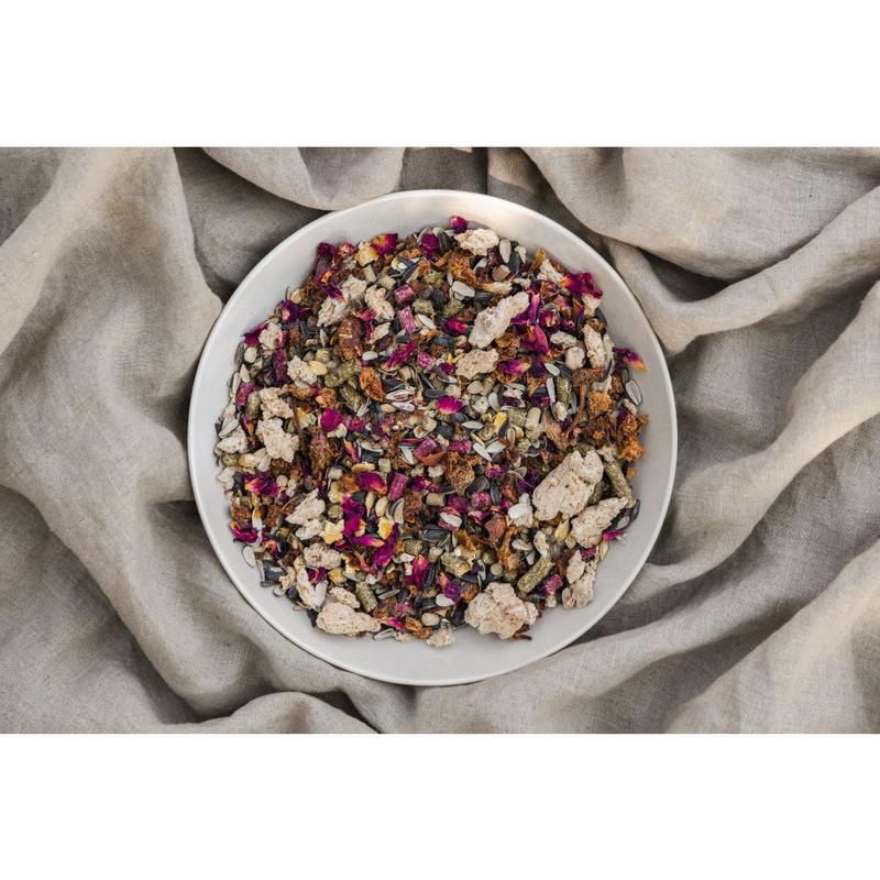 Skład: Susz z lucerny granulowany, otręby ryżowe, granulat witaminowy Grassland Everyday Care, makuch lniany, wytłoki jabłkowe, jęczmień mikronizowany, kukurydza mikronizowana, łuska słonecznika, pszenica ekstrudowana, płatki róży.