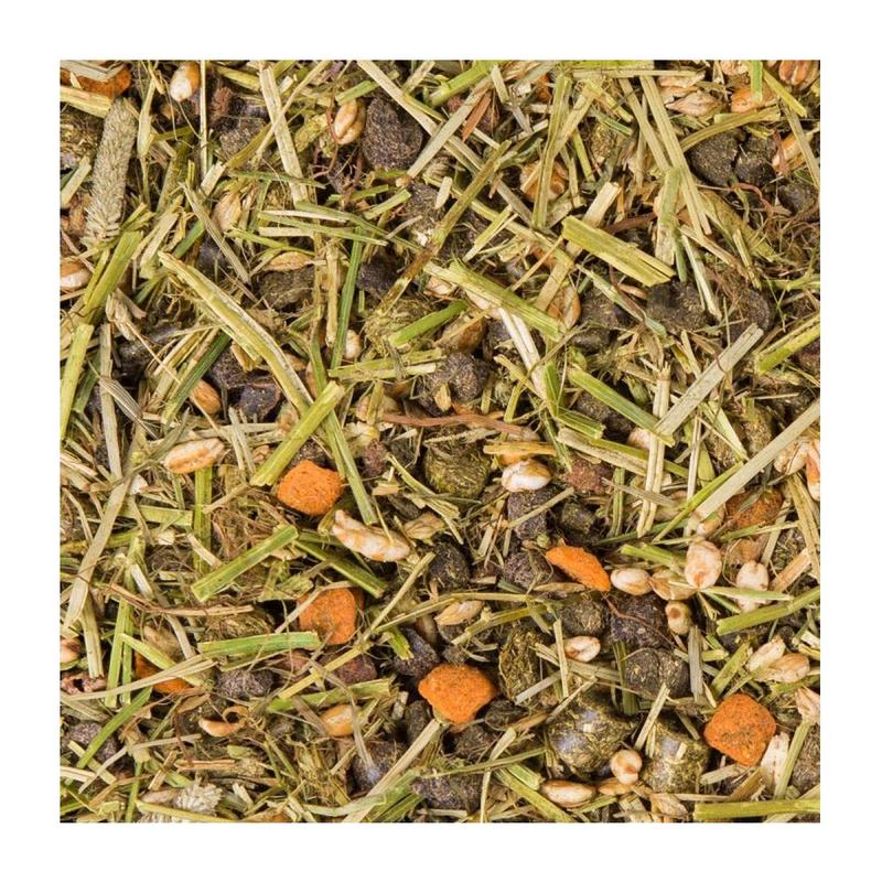 Skład: Lucerna, łuski z nasion słonecznika, płatki jęczmienia, tymotka łąkowa, poekstrakcyjna śruta słonecznikowa, wytłoki z jabłek, kukurydza ekstrudowana, strąki chleba świętojańskiego, jęczmień ekpandowany, olej słonecznikowy, fosforan wapnia, chlorek sodu, węglan wapnia, zioła (bazylia, rozmaryn, koper, mięta, pokrzywa), makuch z siemienia lnianego.