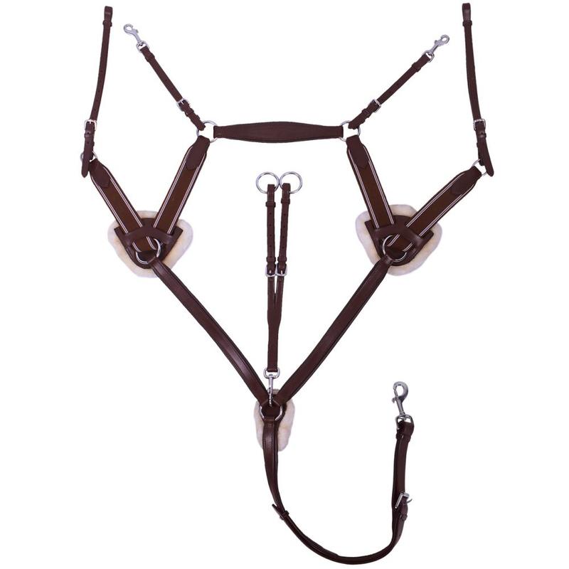 Napierśnik pięciopunktowy firmy QHP. Wykonany z wysokiej jakości skóry oraz materiałów. Posiada miękkie podszycie z futra. Sprzączki wykonane ze stali nierdzewnej.
