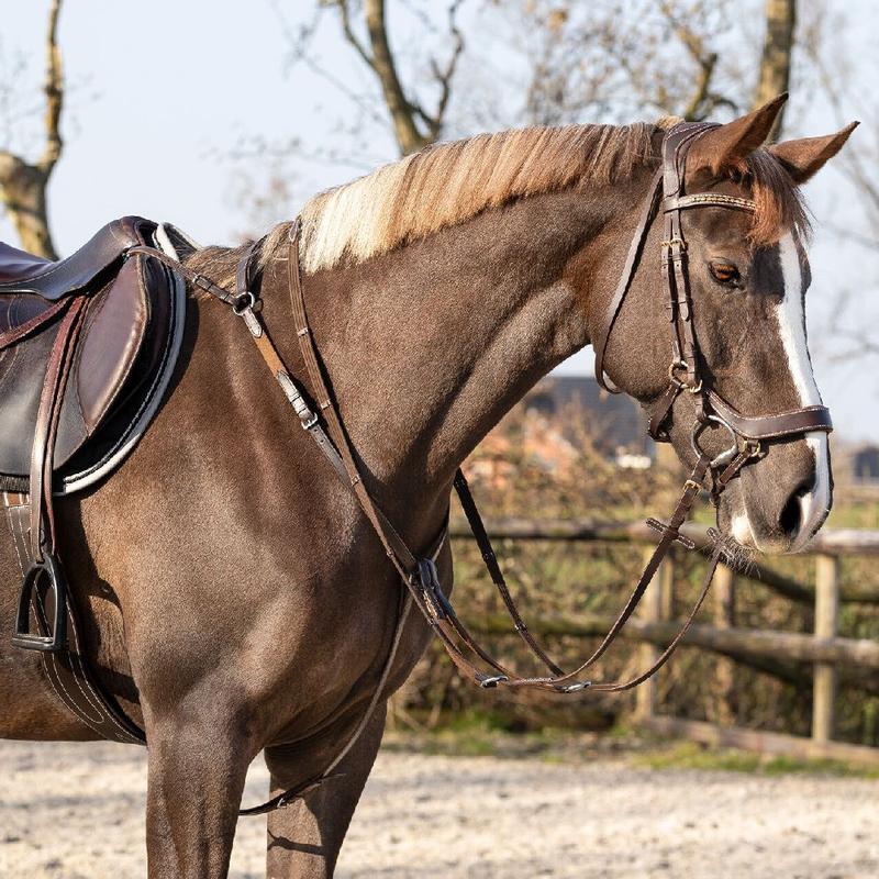 Napierśnik z wodzami bezpieczeństwa firmy Waldhausen. Wodze bardzo pomocne przy młodych lub trudnych do kontrolowania koniach w celu wsparcia jeźdźca.