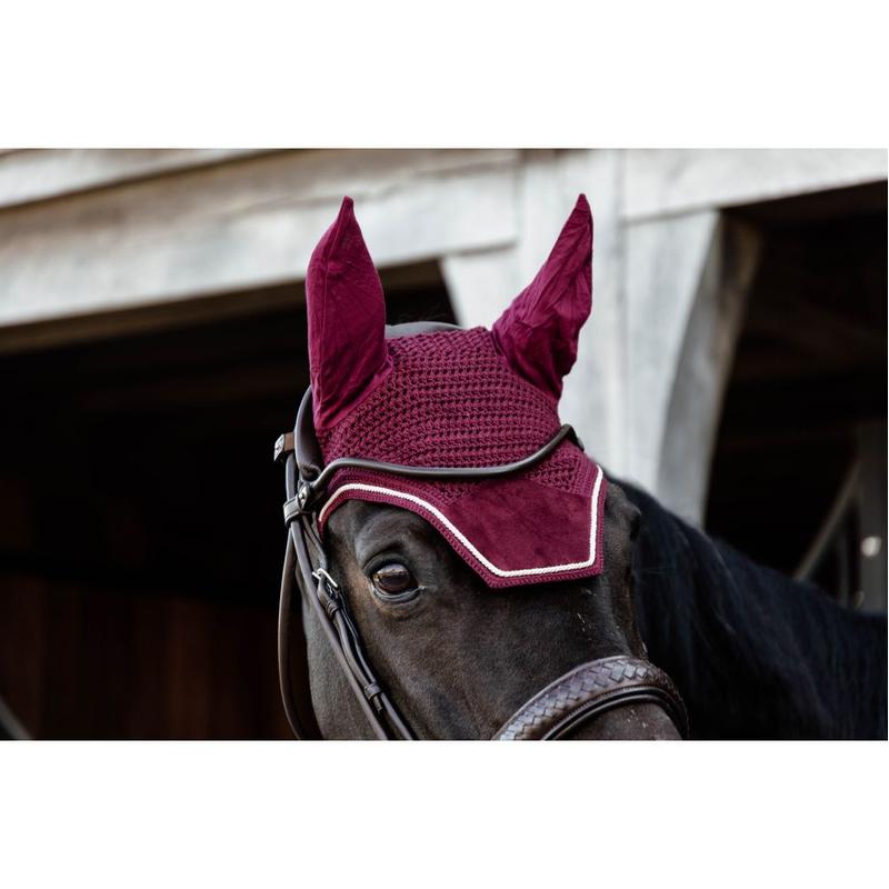 Nauszniki z firmy Kentucky. Chroni uszy konia przed muchami podczas jazdy. Materiał wokół uszu jest rozciągliwy i dopasowany.