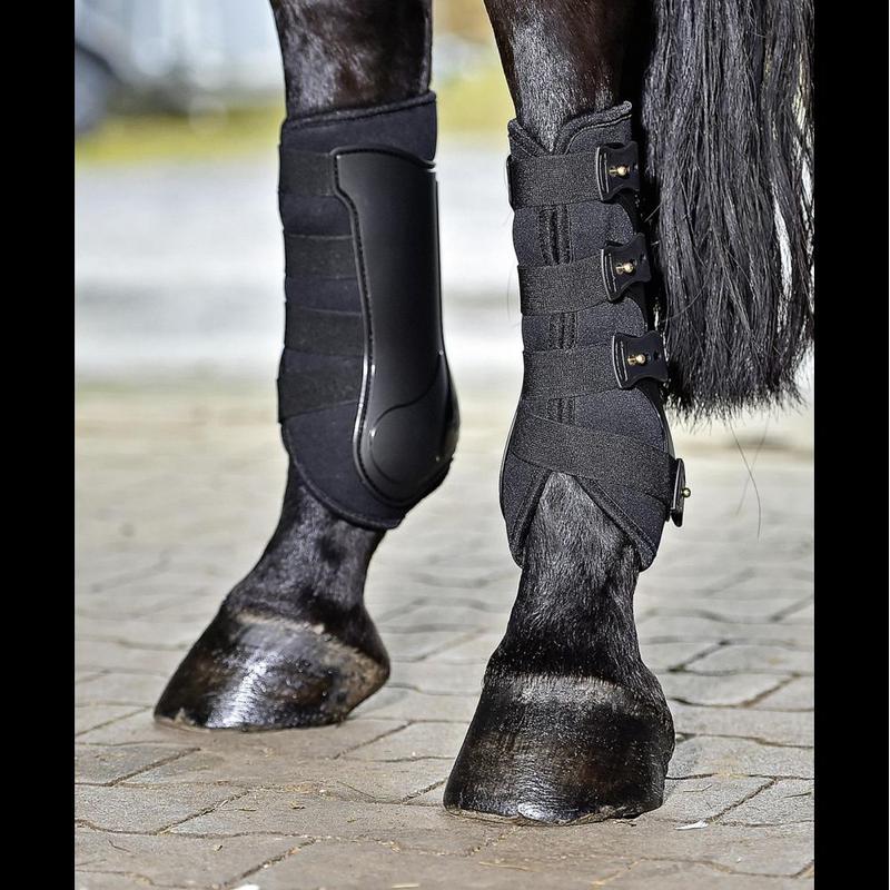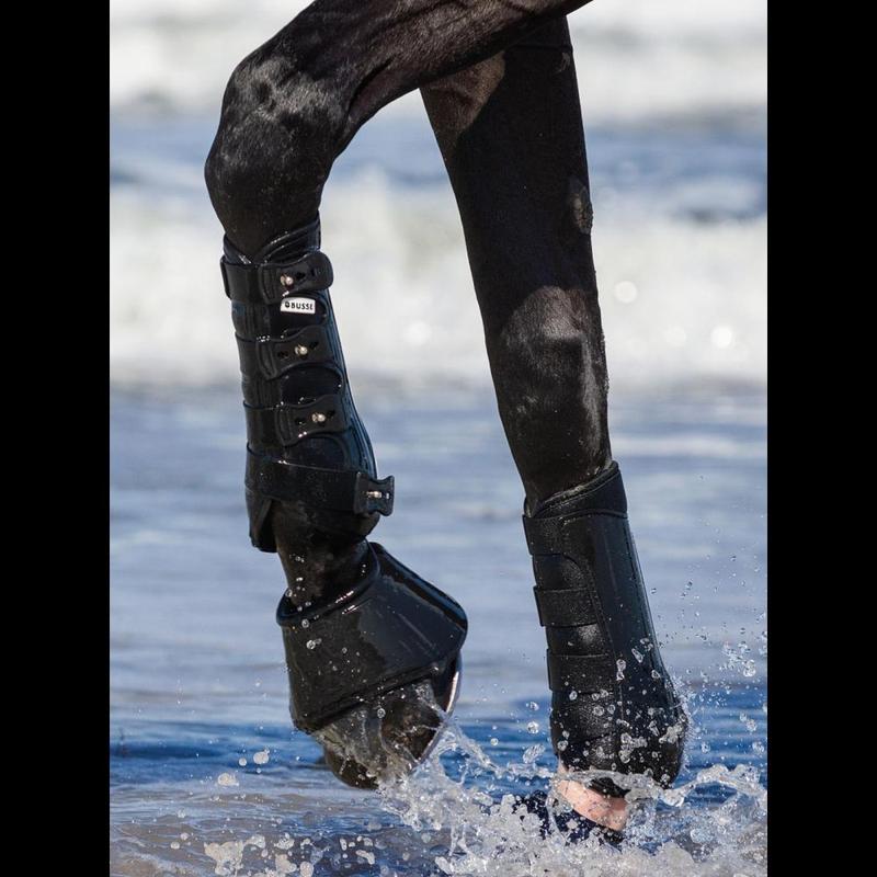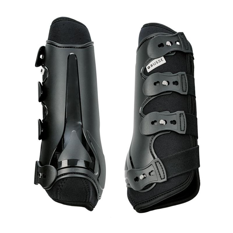 Anatomiczne ochraniacze ujeżdżeniowe firmy Busse, chroniące nogę na całym obwodzie. Mocna skorupa otacza całą pęcinę i przylegające ścięgna. Wewnątrz wyściełane perforowanym syntetycznym kauczukiem, który zapewnia maksymalną cyrkulację powietrza i chroni