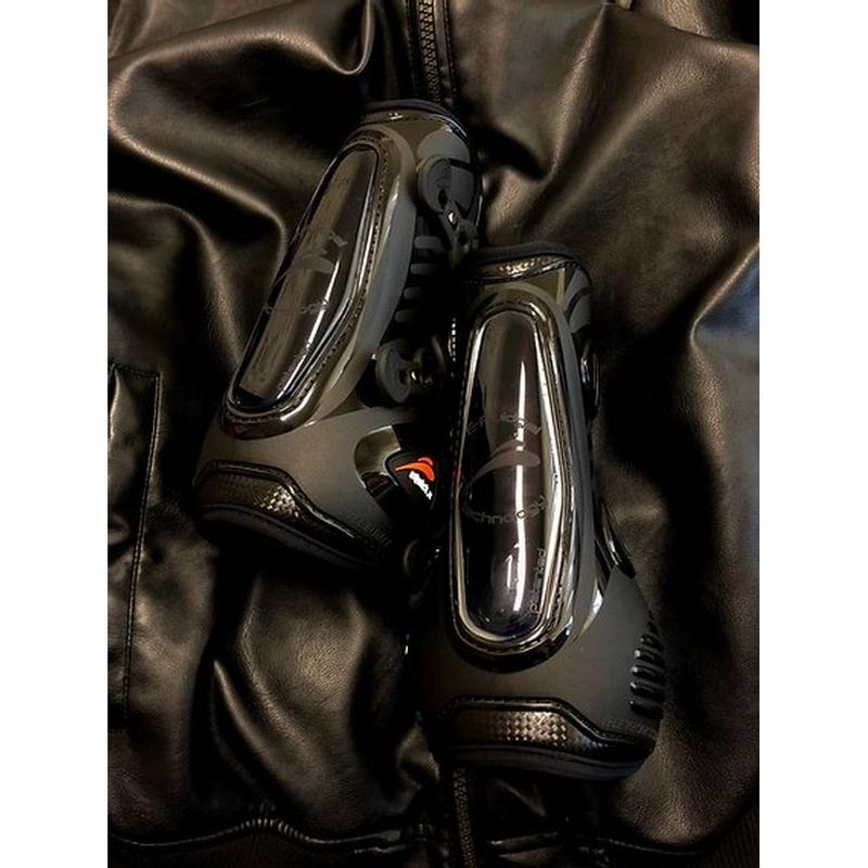 Ochraniacze przednie eShock FluidGel firmy eQuick. Wykonane z bardzo mocnego materiału TPU. Wnętrze wyściełane miękkim neoprenem, wykończone Lycyrą, która zapobiega powstawaniu ran. Wyposażone w elastyczne paski zapinane na kołki, zapewniające łatwą regulację. Posiadają anatomiczny kształt, który chroni ścięgna przed urazami oraz w system eFluidgel. Technologia ta polega na kompresji powietrza (specjalny bąbelek) w żelu, który amortyzuje wstrząs oraz zmniejsza siłę uderzenia. Trwałe, niezawodne oraz wodoodporne. Są bardzo lekkie przez co zapewniają najwyższy komfort użytkowania.