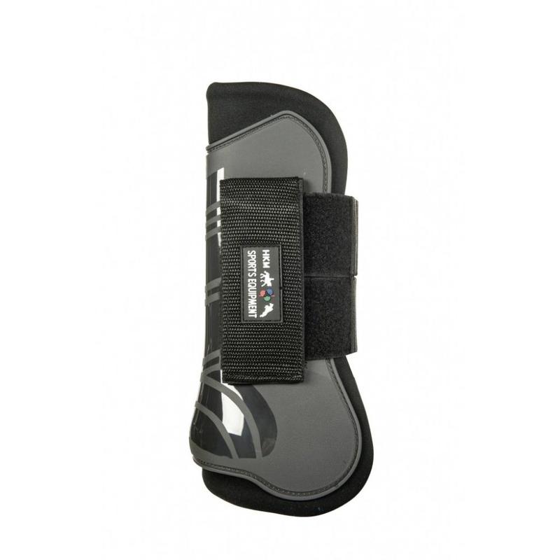 Ochraniacze na tylne nogi Premium firmy HKM. Skutecznie chronią nogę konia oraz tłumią uderzenie. Wykonane z elastycznego materiału softoprenowego o dużej wytrzymałości, zapinane na rzep o szerokości ok. 5cm.