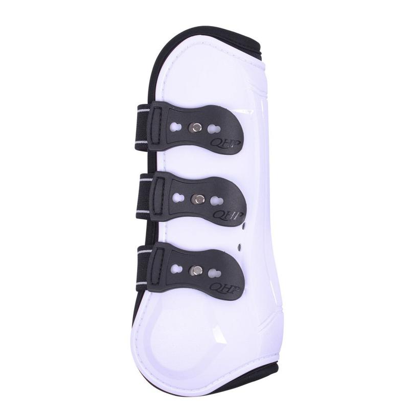 Ochraniacze przednie firmy QHP. Wykonane z mocnego plastikowego tworzywa z ozdobnymi paskami. W wewnątrz podszyty miękkim neoprenem. Zapinane na kołki.Zapewniają doskonałą ochronę przednich nóg konia przed uderzeniami oraz wstrząsami.