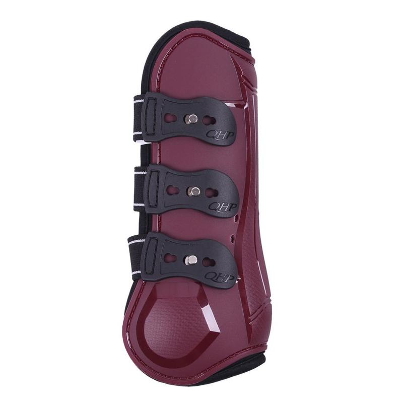Ochraniacze przednie firmy QHP. Wykonane z mocnego plastikowego tworzywa z ozdobnymi, błyszczącymi paskami. W wewnątrz podszyty miękkim neoprenem. Zapinane na kołki.Zapewniają doskonałą ochronę przednich nóg konia przed uderzeniami oraz wstrząsami.